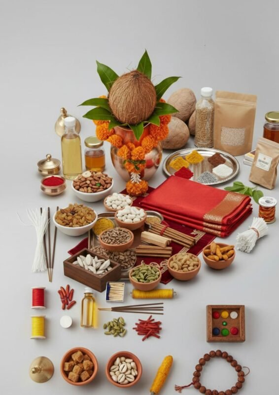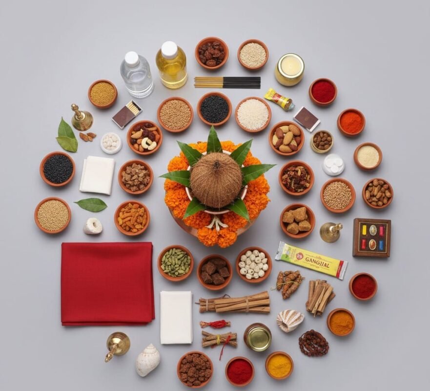 Space Purification (Shuddhikaran): Includes essential elements like Ganga Jal, Havan herbs, and Gaumutra to cleanse the environment and remove any “Vastu Dosha” (architectural imbalances) before you reside in the home.